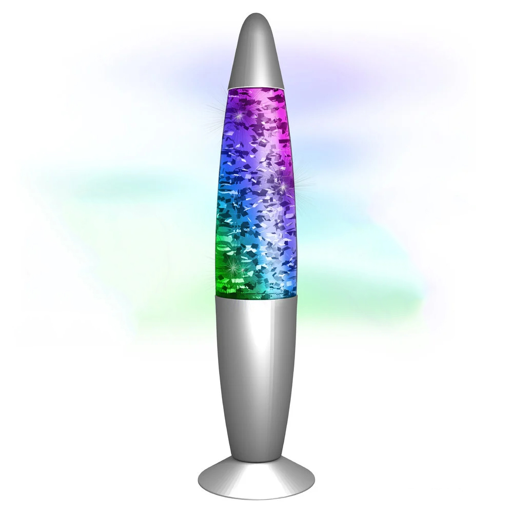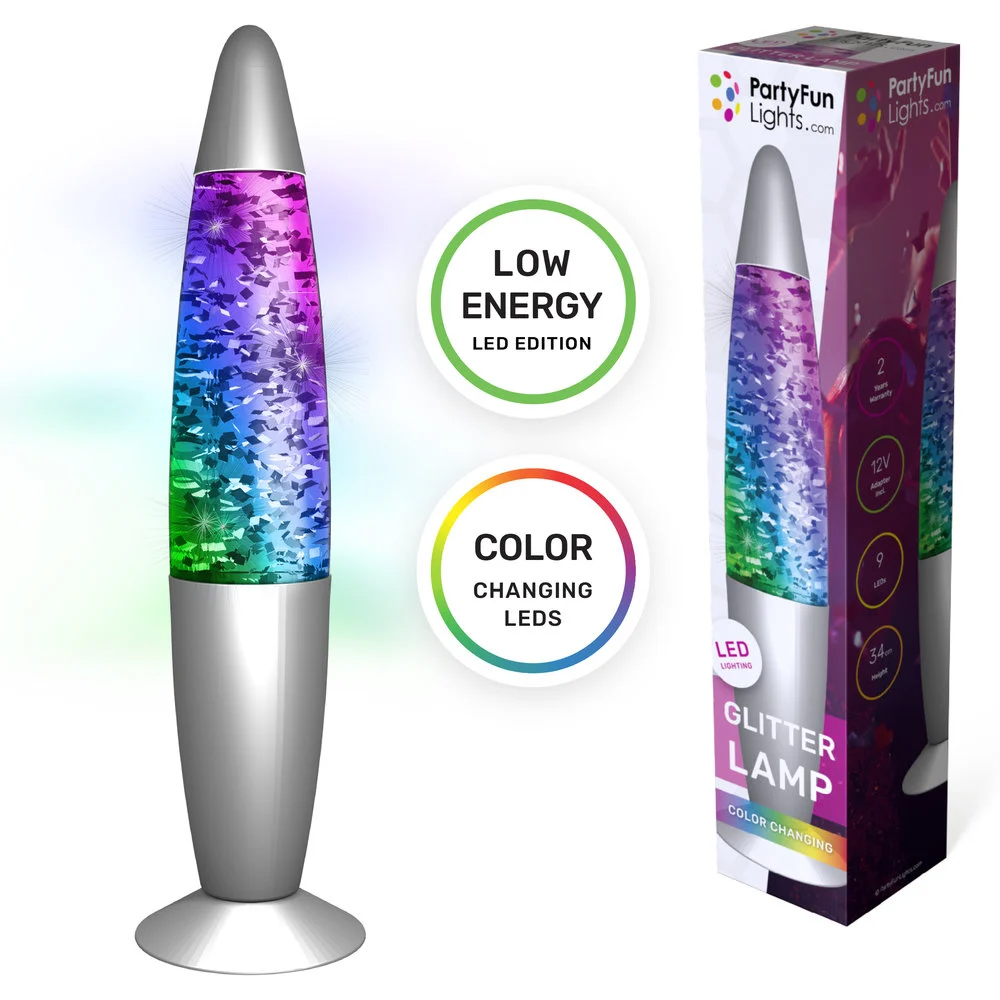 Met deze glitterlamp kan je een gave en relaxte sfeer maken waar je maar wilt. Deze lavalamp heeft 9 kleur-veranderende LEDs en de hoogte van de lamp is 34cm. Steek de stekker in het stopcontact en geniet van het betoverende effect. De verpakking bevat de glitterlamp en een 12V adapter.