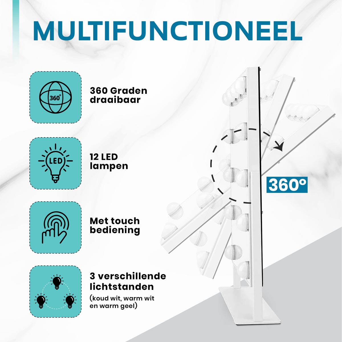 Füge einen Hauch von Luxus und Komfort zu deiner täglichen Schönheitsroutine hinzu mit diesem LED Make-up Spiegel! Mit der Nutzung dieses Make-up Spiegels vermeidest du häufige Make-up-Fehler und dein Make-up sitzt immer perfekt. Der Spiegel ist mit 12 hellen LEDs um den Spiegel herum ausgestattet, die für gleichmäßige Beleuchtung ohne Schatten sorgen. So kannst du dein Make-up leicht auftragen und deine Hautpflegeroutine perfektionieren. Du kannst einfach zwischen den 3 verschiedenen Lichtmodi (kaltweiß, warmweiß und warmgelb) wechseln und die Helligkeit mit der einfachen Touch-Steuerung mit Dimmer anpassen. So hast du immer die richtige Lichtmenge für jede Situation. Der Spiegel steht auf einem robusten Ständer und ist neigbar, sodass du ihn in jedem gewünschten Winkel für die perfekte Sicht platzieren kannst. Ideal zum Auftragen von Make-up, Augenbrauen zupfen und vieles mehr. Das schlanke Design macht den Spiegel zu einem modernen Accessoire auf deinem Schminktisch oder im Badezimmer. Die ultimative Wahl für alle, die auf der Suche nach einem hochwertigen Make-up Spiegel sind!