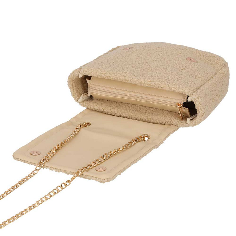 Die Kombination aus weichem Teddy-Stoff, der stilvollen goldenen Kette und dem kompakten Format macht diese Tasche zu einem modischen und praktischen Accessoire für jeden Tag!