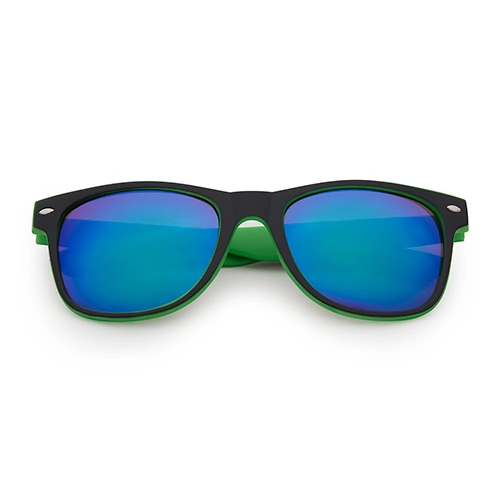 Mit diesem Klassiker liegen Sie immer richtig! Das perfekte Wayfarer-Modell für jedes Festival. Beliebte Party Sonnenbrille mit schwarz/grünem Gestell und blauen Spiegellinsen. Der Klassiker schlechthin!