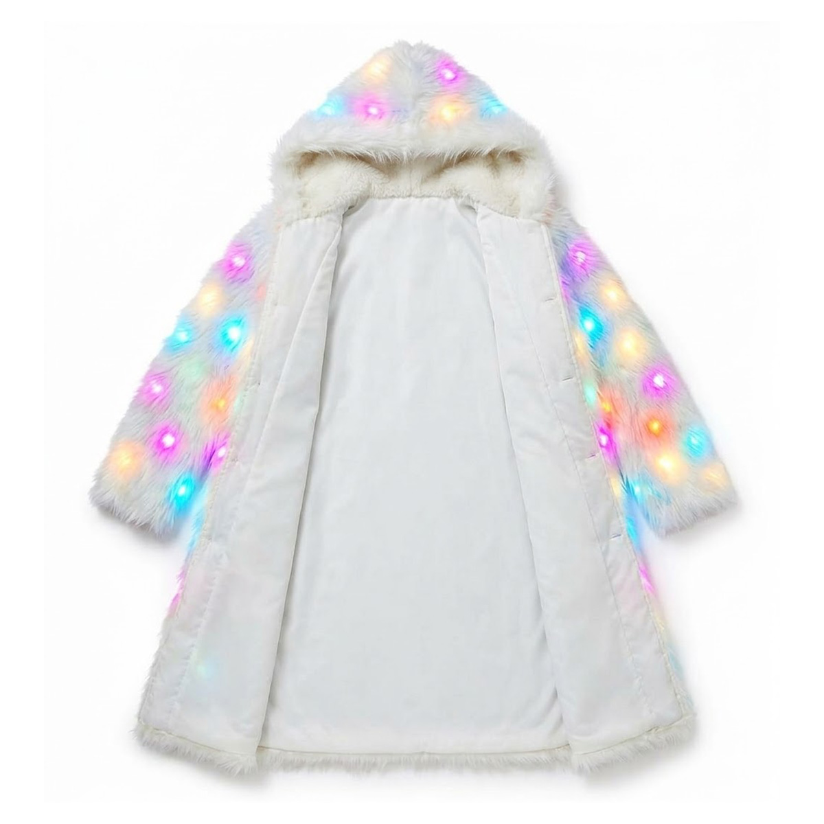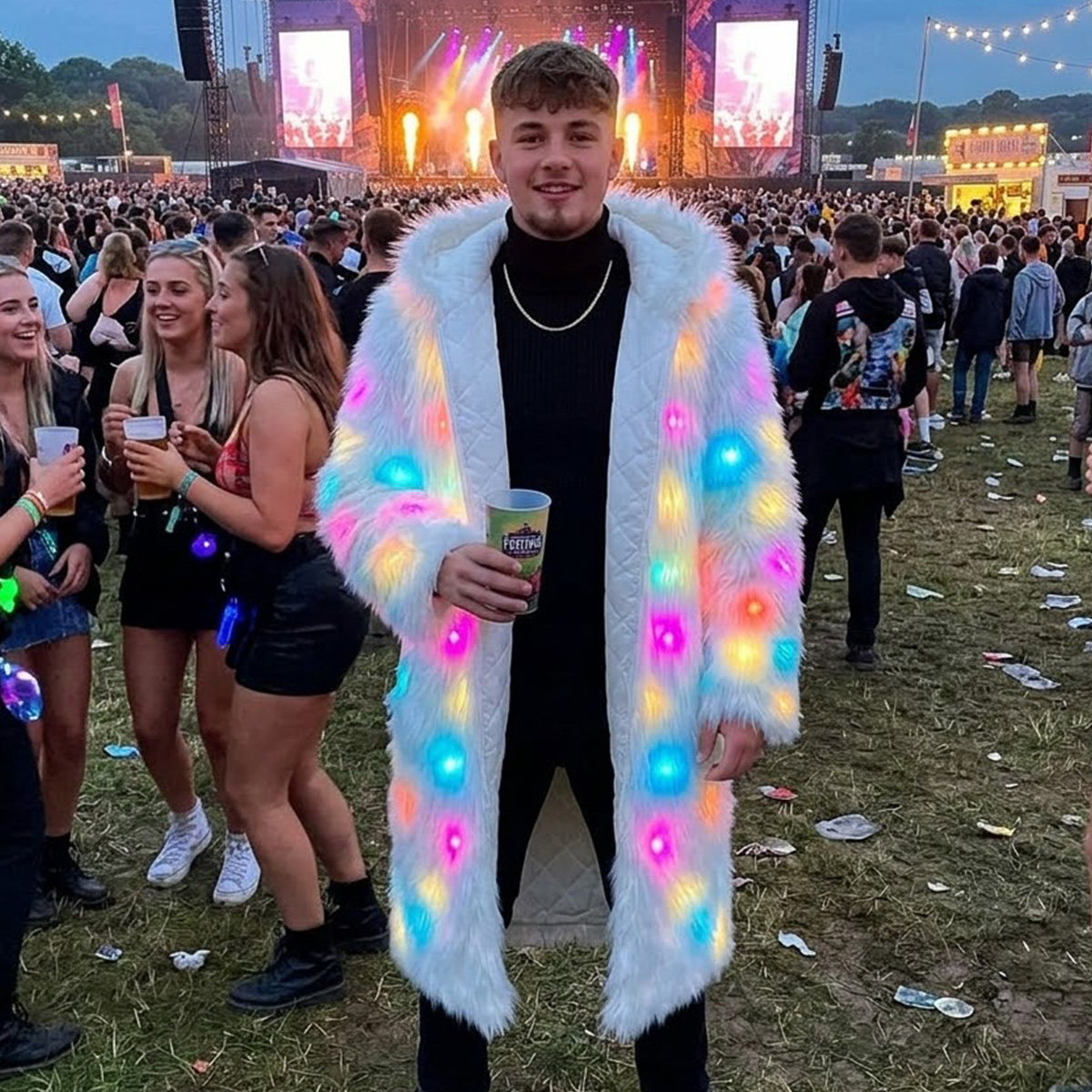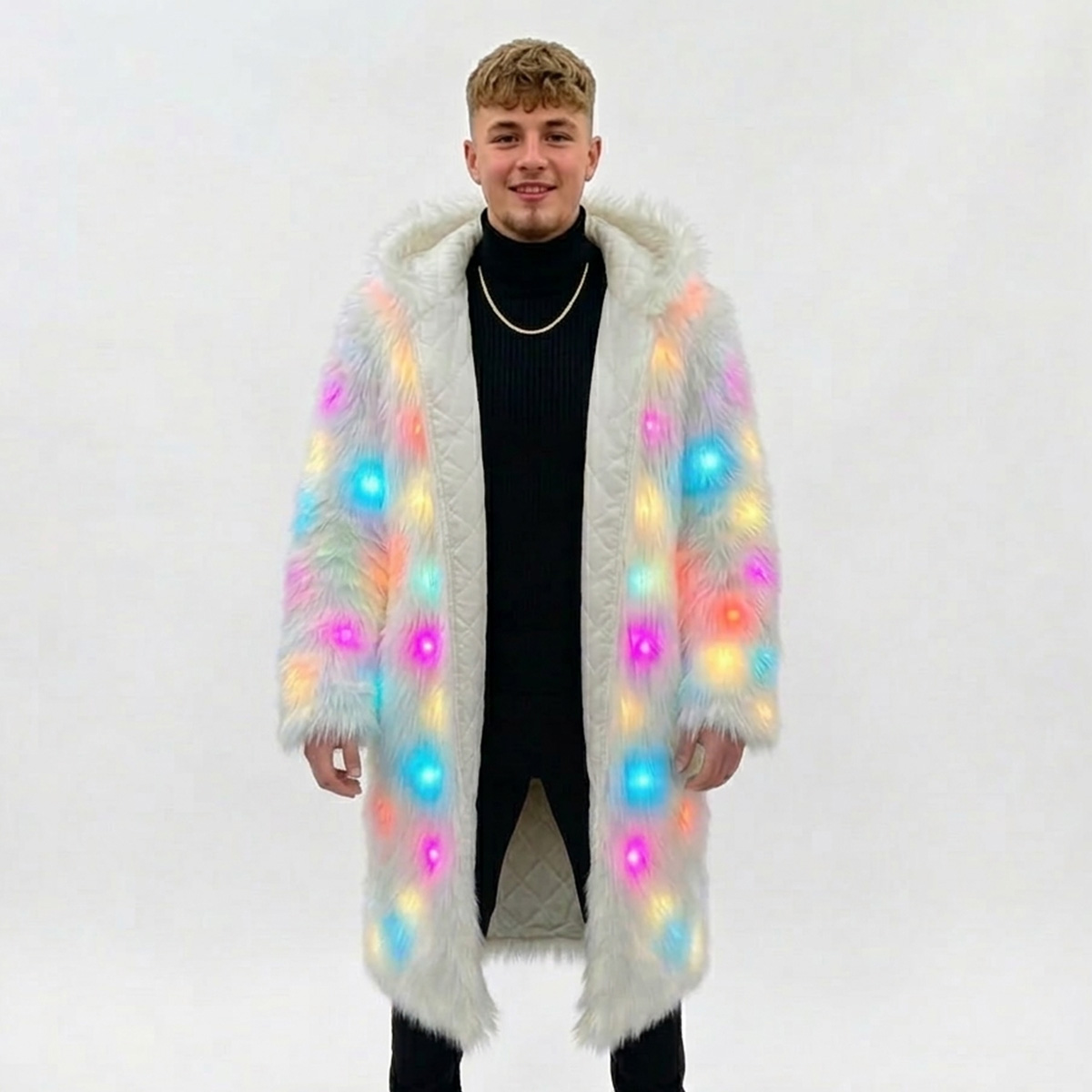 Bist du auf der Suche nach dem ultimativen Outfit für ein Festival, Karneval oder eine Mottoparty? Dieser weiße LED-Faux-Fur-Kunstpelzmantel ist die perfekte Kombination aus Stil und Spektakel. Der Mantel besteht aus hochwertigem, weichem Kunstpelz, der nicht nur großartig aussieht, sondern dich auch in kalten Nächten warm hält.