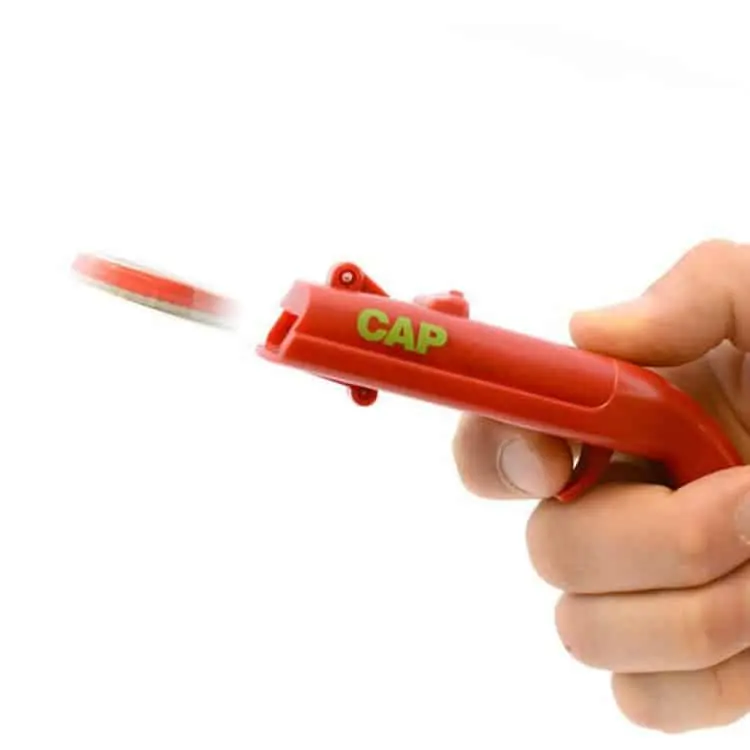 Spanne die Feder, indem du einen Knopf nach unten drückst. Wenn sie einrastet, lass sie los, öffne dein Bier. Der Deckel bleibt dann darin stecken. Anschließend drückst du den Knopf unten und schießt den Deckel weg!
