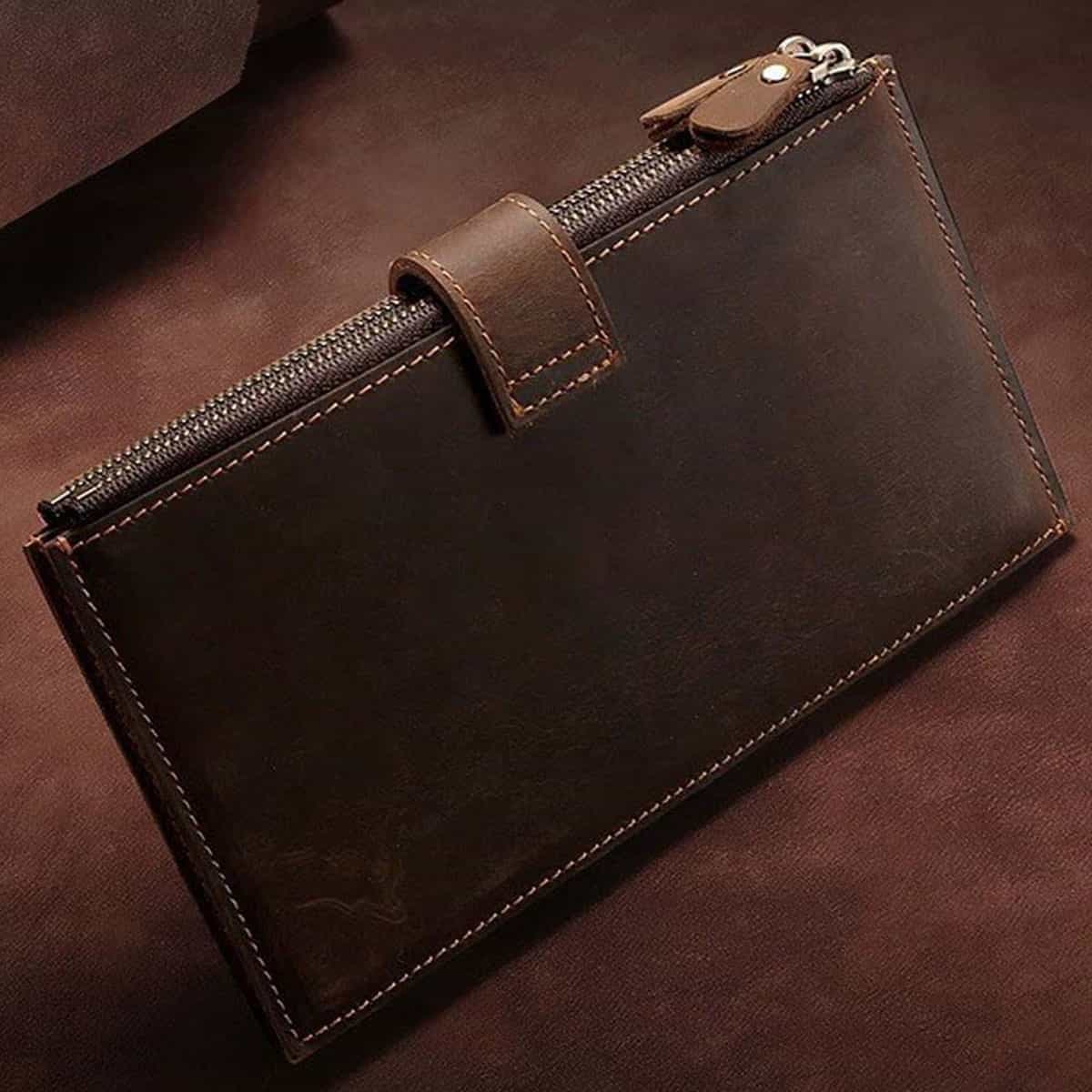 Dieses Portemonnaie, hergestellt aus hochwertigem Leder in klassischem Braun, wurde entworfen, um all Ihren Bedürfnissen gerecht zu werden. Mit einer großzügigen Größe von 12 x 20 cm und nicht weniger als 16 Fächern für Karten sowie 2 großen Reißverschlussfächern, bietet dieses Portemonnaie jede Menge Platz und Organisierung für Ihre essenziellen Gegenstände. Bei geöffneter Brieftasche hat diese eine Größe von 12 x 38,5 cm und ist mit einem Druckknopf verschließbar. Außerdem enthält die Brieftasche RFID-Technologie, um das unerwünschte Auslesen von RFID-Chips in Kreditkarten, Personalausweisen und anderen Karten zu verhindern.