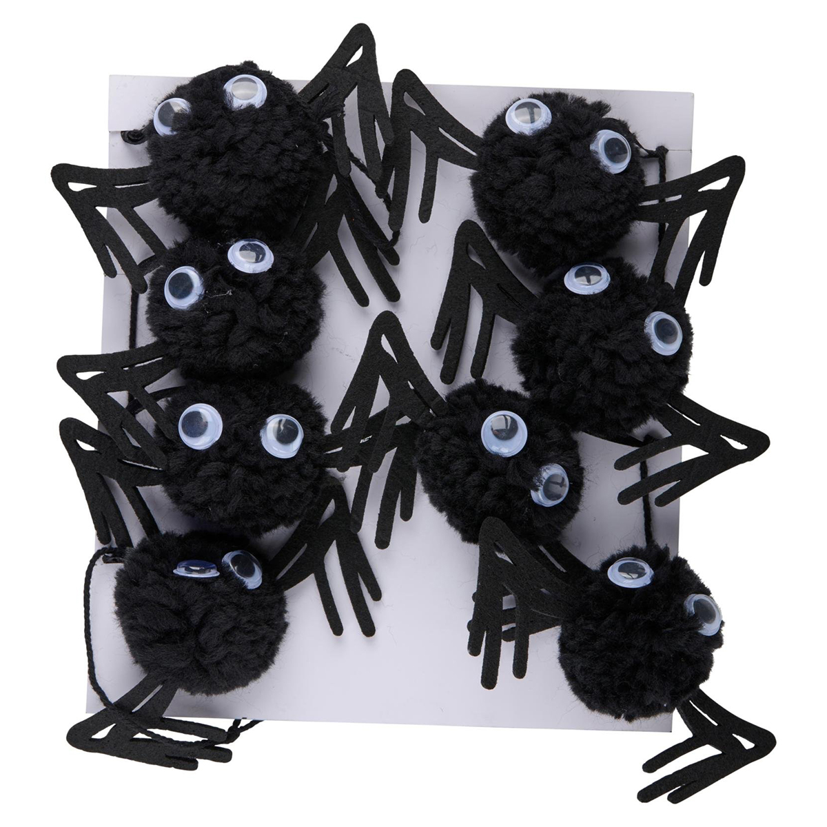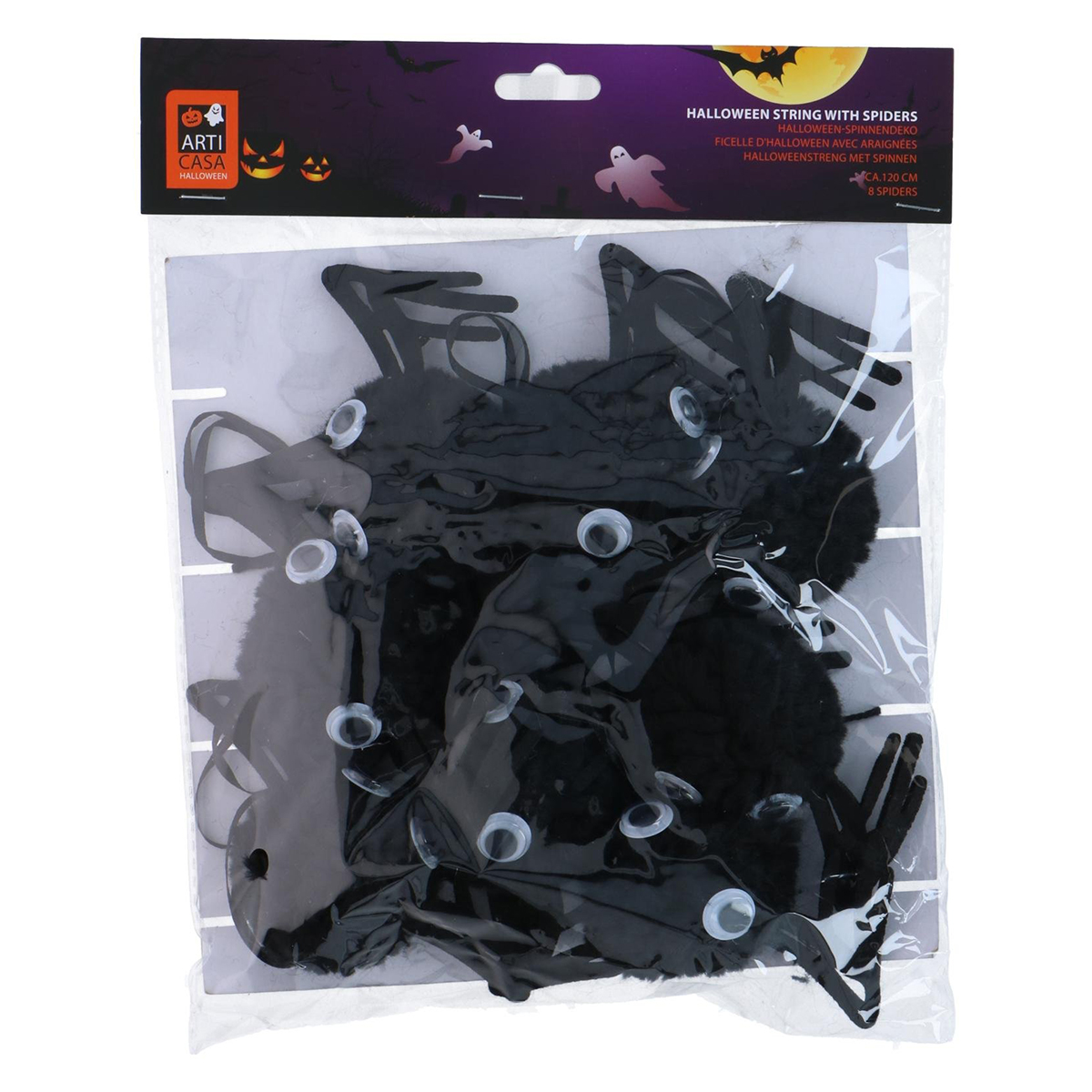 Mache dein Halloween-Fest komplett mit dieser Halloween-Girlande mit hängenden Spinnen! Mit einer Länge von ganzen 120 cm und acht flauschigen, schwarzen Spinnen sorgt diese Dekoration garantiert für einen schaurigen Akzent in jedem Raum. Die niedlich-gruseligen Spinnen mit Wackelaugen und weichen Beinen baumeln an schwarzen Fäden und scheinen sich schon beim kleinsten Luftzug zu bewegen – perfekt, um deinen Gästen einen Schauer über den Rücken zu jagen! Die Spinnen bestehen aus leichtem Material und sind an einer stabilen schwarzen Kordel befestigt, sodass die Girlande einfach aufgehängt werden kann. Verwende sie als Wanddeko, über einem Tisch, entlang des Treppengeländers oder am Eingang deiner Partylocation, um schon beim Betreten für eine gruselige Atmosphäre zu sorgen. Dank des kompakten Formats lässt sie sich zudem einfach verstauen und im nächsten Jahr wiederverwenden. Egal, ob du eine Halloween-Party, einen Kindergeburtstag oder einen schaurigen Themenabend veranstaltest – diese Spinnengirlande sorgt sofort für die richtige Stimmung. Kombiniere sie mit anderen Halloween-Dekorationen wie Kürbissen, Spinnennetzen oder Lichterketten für ein komplett gruseliges Ensemble. Mit dieser gruseligen Spinnengirlande verwandelst du jeden Raum im Handumdrehen in ein wahres Spukparadies – bereit für eine Halloween-Party, die man nie vergisst!