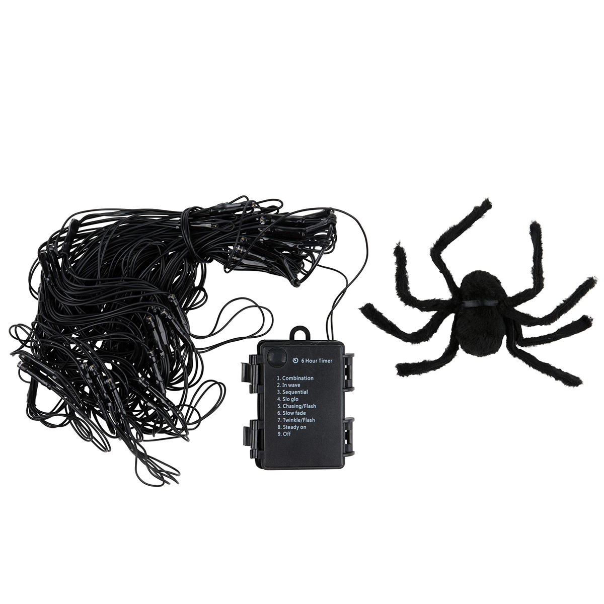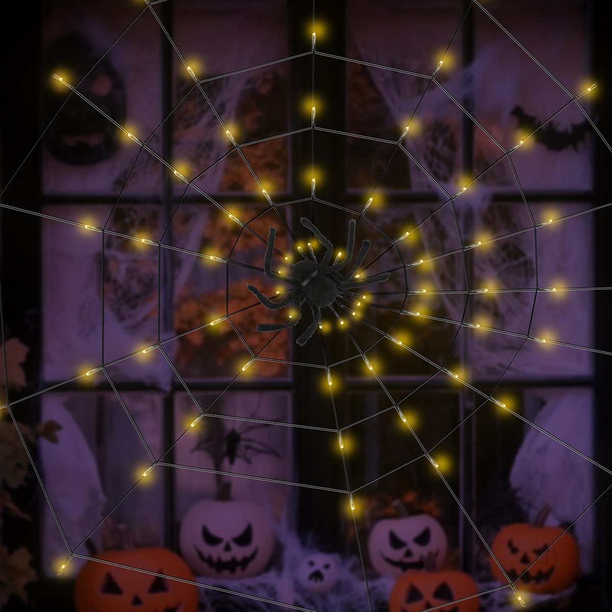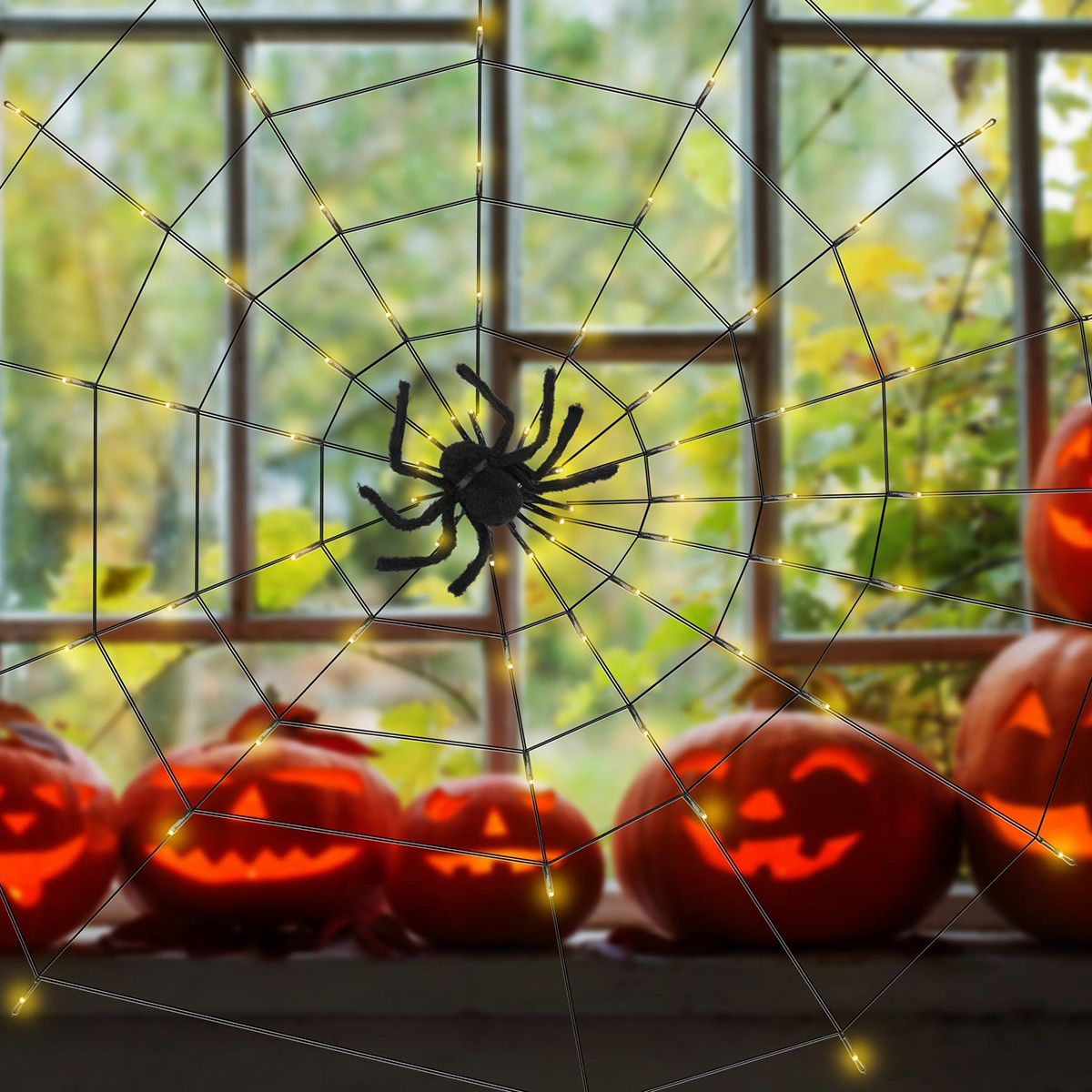 Das Spinnennetz besteht aus stabilem Draht und ist mit Befestigungspunkten ausgestattet, sodass es einfach an Fenstern, Wänden, Decken oder draußen an einer Veranda oder Fassade aufgehängt werden kann. Kombiniere dieses dekorative Netz mit Kürbissen, Kunstblut, Spinnweben oder Grabsteinen für eine schaurige Halloween-Kulisse. Ob für eine Halloween-Party, einen Trick-or-Treat-Abend oder eine gruselige Mottoparty – dieses beleuchtete Spinnennetz mit unheimlicher Spinne sorgt garantiert für Gänsehaut und jagt deinen Gästen einen ordentlichen Schrecken ein!