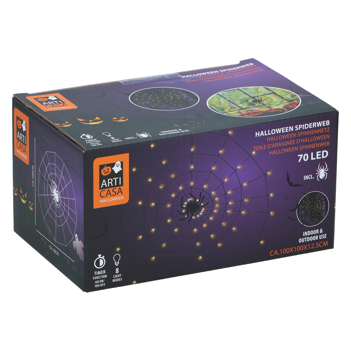 Verwandle dein Zuhause in eine echte Spuk-Location mit dieser Halloween-Spinnennetz-Lichterkette mit 70 LED-Lämpchen und Timerfunktion! Mit ihren beeindruckenden Maßen von 100 x 100 x 12,5 cm ist dieses Netz eine auffällige Dekoration für jede Halloween-Party, sowohl drinnen als auch draußen. Die 70 warmweißen LED-Lichter sorgen für einen stimmungsvollen Schimmer, während die große Plüschspinne in der Mitte den ultimativen Gruselfaktor hinzufügt. Dank der integrierten Timerfunktion musst du die Beleuchtung nicht mehr manuell ein- oder ausschalten. Die Lichter leuchten automatisch 6 Stunden und schalten sich dann 18 Stunden aus, danach beginnt der Zyklus von vorne – ideal für den täglichen Gebrauch in der Halloween-Saison.