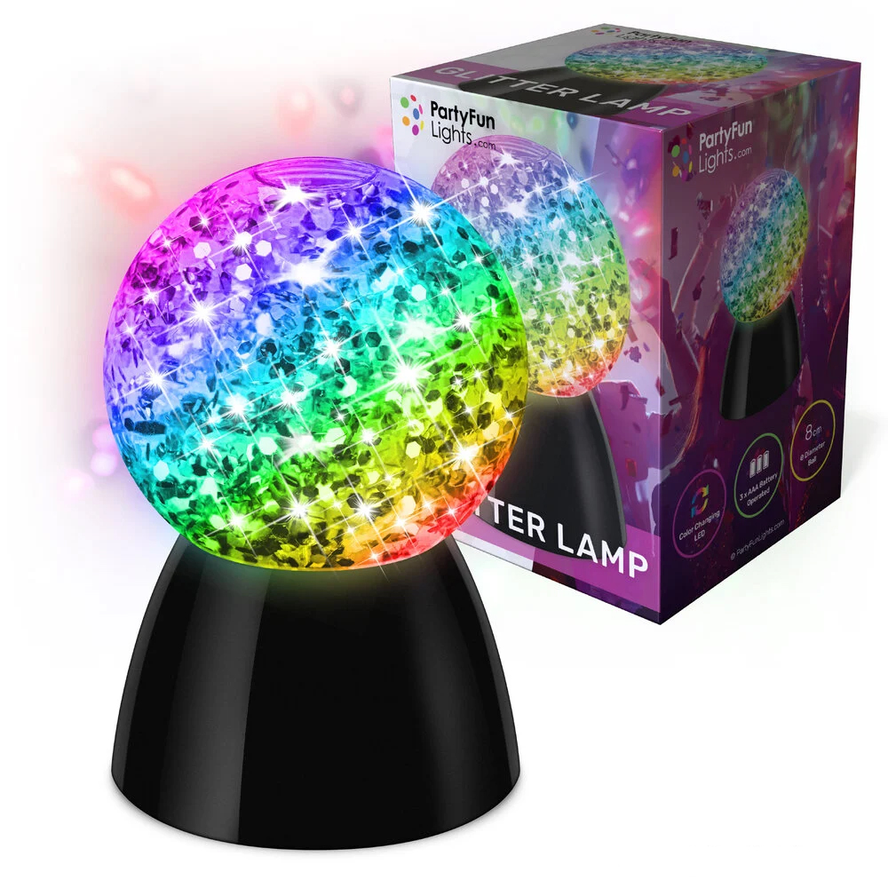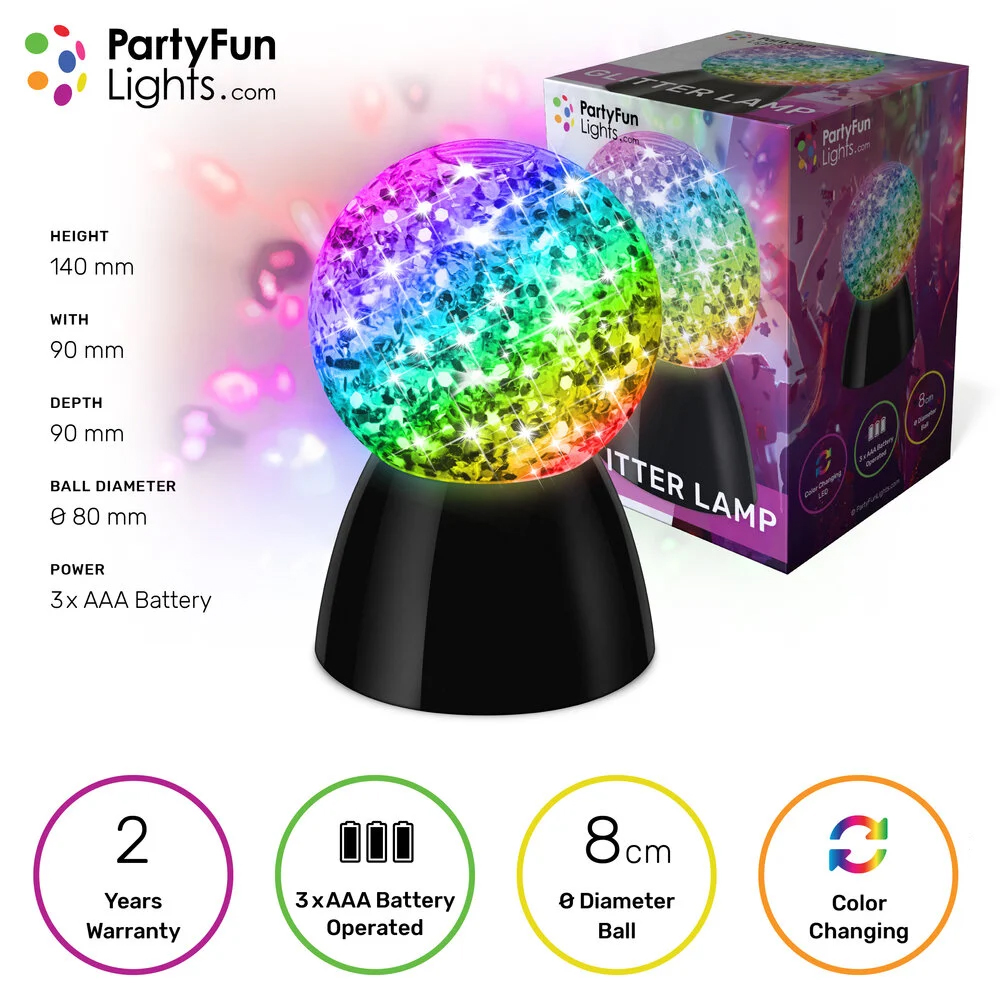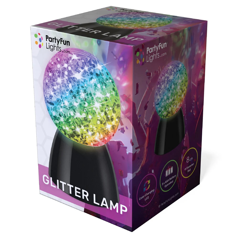 Verander elke kamer in een magische ruimte met deze multi-color glitter-bol-lamp. Heldere LED’s creëren fantatische lichtpatronen op het plafond en de muren. De bol zit vol met glitters die een roterende beweging maken, dus de felgekleurde lichtpatronen zullen overal in de ruimte te zien zijn. De diameter van de glitter-bol is 9cm. Dit licht wordt gevoed door 3 x AA batterijen (niet meegeleverd). Met deze Glitter-Bol-Lamp til je je kamer naar een hoger niveau!
