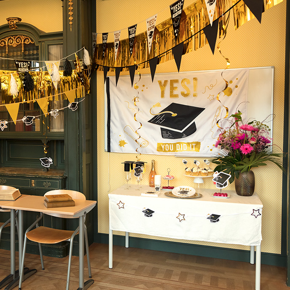 Ein Abschluss in der Tasche? Dann darf natürlich eine festliche „Bestanden“-Fahne nicht fehlen! Mit dieser Polyesterfahne mit dem Aufdruck ‚Yes! You did it‘ zeigst du auf fröhliche und auffällige Weise, dass jemand bestanden hat. Hänge die Fahne an die Fassade, befestige sie an einer Fahnenstange und mach die Feier komplett, indem du eine Schultasche daran hängst. So weiß sofort jeder in der Straße, dass eine tolle Leistung erbracht wurde.