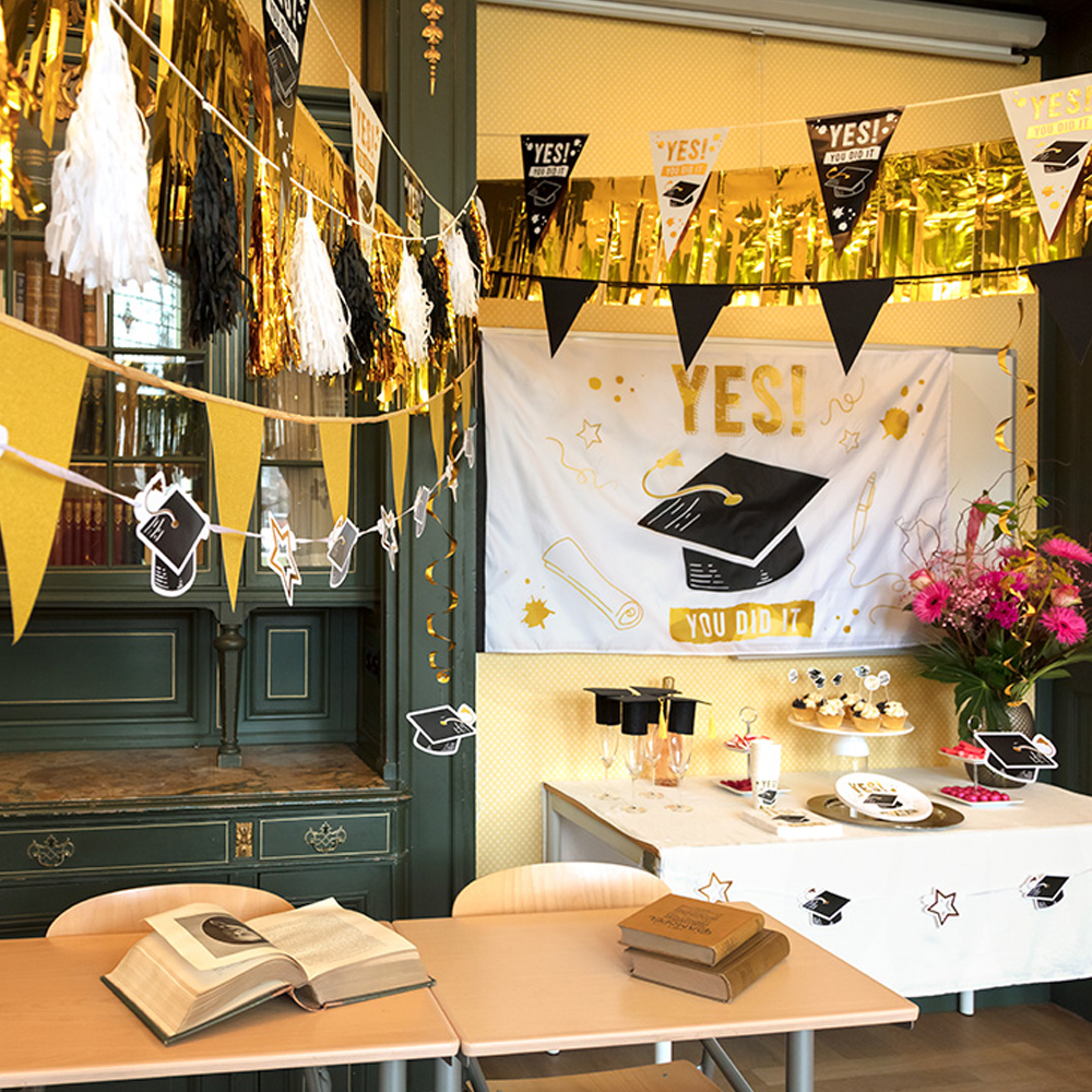 Mit dieser fröhlichen ‚Yes! You did it‘-Fahne gestaltest du deine Diplomvergabe oder Abschlussfeier extra festlich. Hänge sie an die Fassade oder an eine Fahnenstange und mach es komplett, indem du eine Schultasche daran befestigst! Dank ihres großzügigen Formats von 90 x 150 cm und dem leichten Polyester ist diese Fahne die perfekte Dekoration für jeden bestandenen Moment – vom Abitur bis zur Studienfeier!