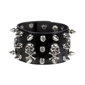 Das Armband ist breit geschnitten und reich verziert mit silbernen Spikes, dekorativen Nieten und mehreren Totenköpfen. Dadurch erhält dieses Accessoire einen ausgeprägten Stil, der perfekt zu Festival-Outfits, Mottopartys, Karneval und rockigen Looks passt. Auch einem Casual-Look verleiht dieses Punk-Armband sofort mehr Charakter.