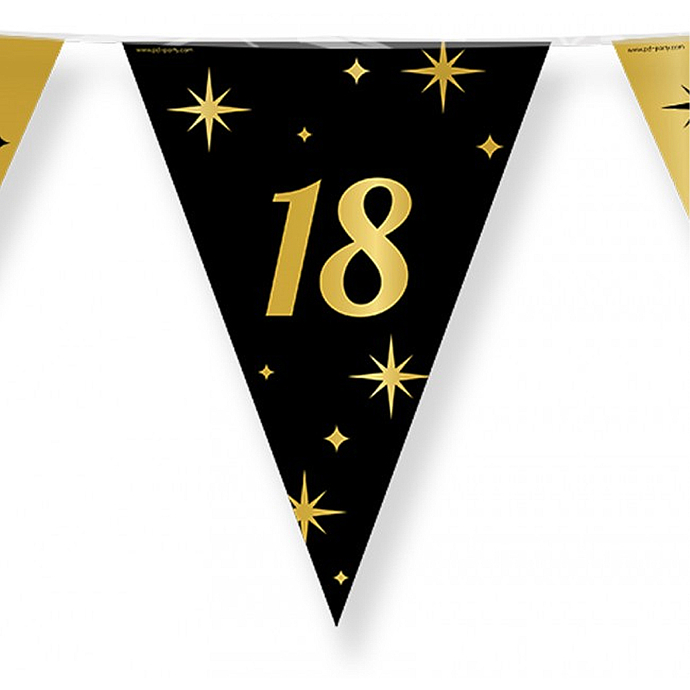 Feierst Du bald Deinen 18. Geburtstag? Mach Deine Geburtstagsparty extra festlich mit dieser wunderschönen Gold-Schwarz-Wimpelkette! Die Wimpelkette ist schick gestaltet, aus hochwertigem Folienmaterial gefertigt und 10 Meter lang. Sie lässt sich leicht aufhängen, indem Du die Enden irgendwo festknotest. So kannst Du die Wimpel zum Beispiel an Wänden, Decken, Tischen oder überall dort aufhängen, wo Du möchtest und den Raum noch festlicher gestalten. Diese wunderschöne Gold-Schwarz-Wimpelkette wird Deinen 18. Geburtstag noch festlicher machen. Hipp Hipp Hurra!
